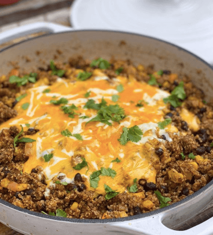 Sofríe la cebolla y el ajo en aceite de oliva por 2 minutos o hasta que la cebolla se ponga transparente. Agrega la carne molida y sepárala mientras la cocinas, hasta que ya no veas pedazos de carne cruda, apróx 3 min. Agrega las especias y sofríe junto a la carne por 1 minuto, asegurándote que estén igualmente distribuidas. Agrega el ají y pasta de tomate y cocina por 1 minuto. Agrega la quinoa, agua, maíz y habichuelas, une todo y remueve varias veces. Cuando empiece a hervir, baja a fuego medio y tapa la olla. Deja cubierta por 15 minutos o hasta que la quinoa esté lista. Apaga el fuego, abre la olla y separa la quinoa con un tenedor. Rápidamente entra 3/4 del queso, mueve y usa el otro 1/4 para poner arriba, tapa la olla 1 min para que el queso se derrita con el calor residual. Decora con un poco de cilantro picadito.